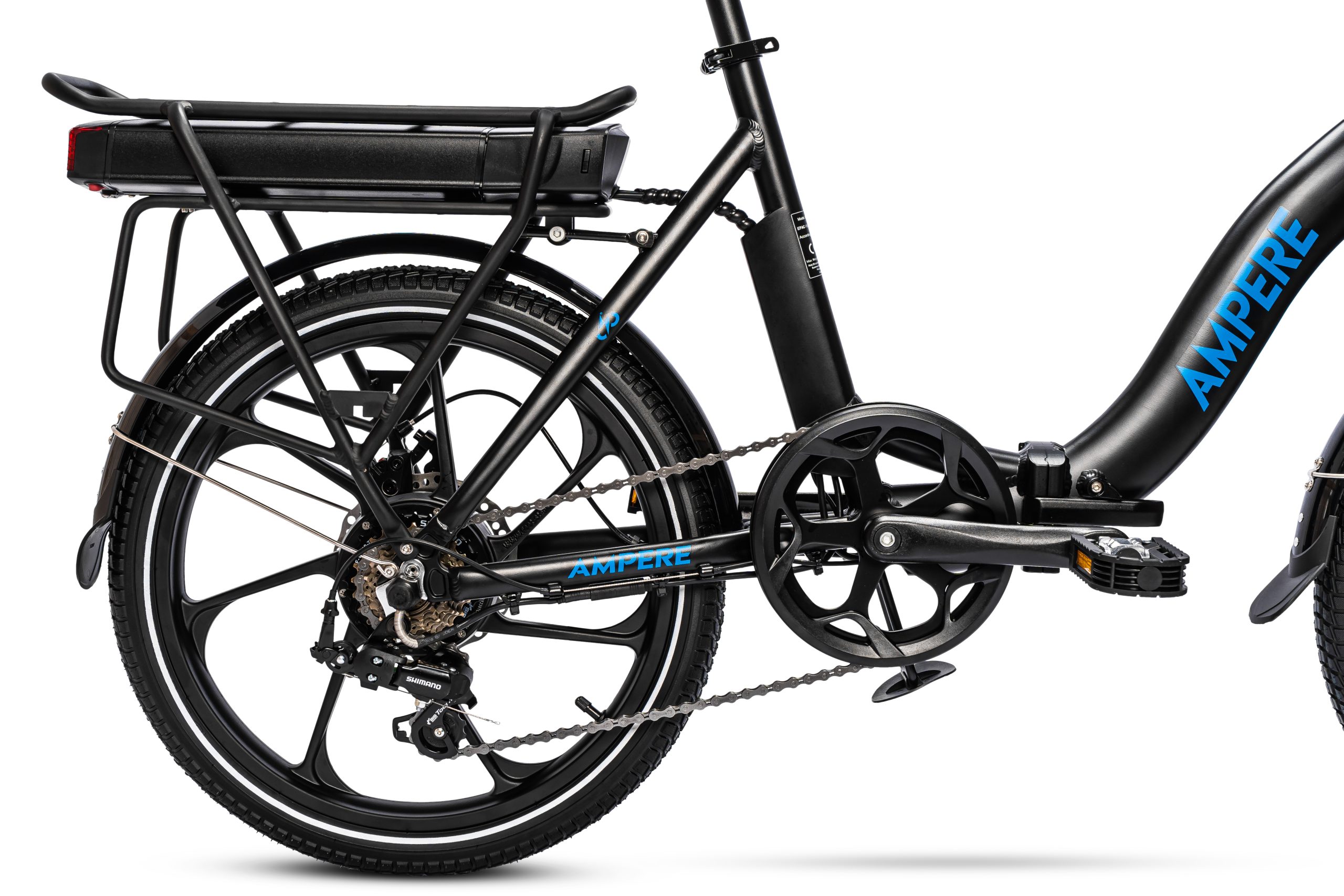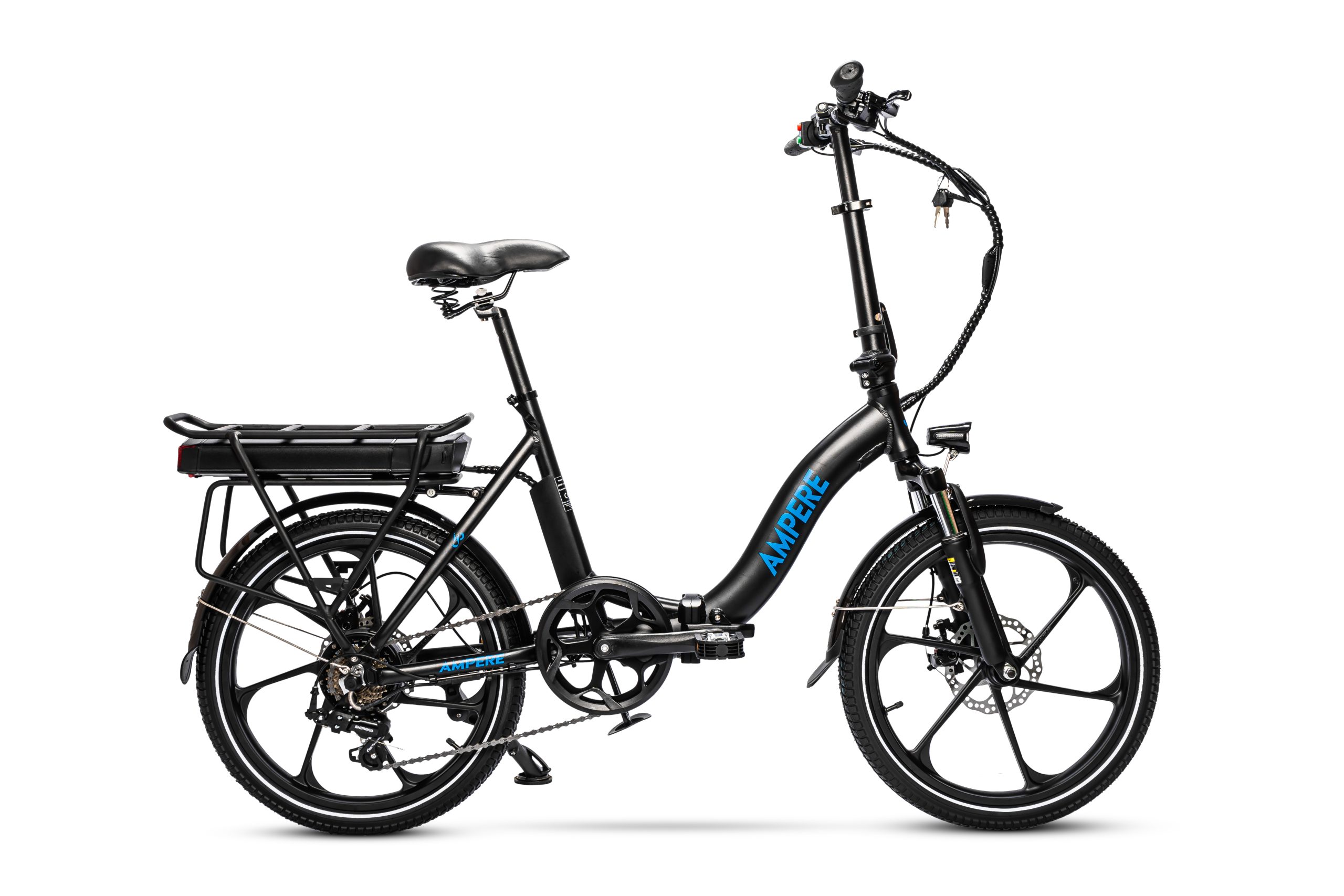 Rims: 20″ Mag alloy wheels — lightweight and sturdy for folding bike use.